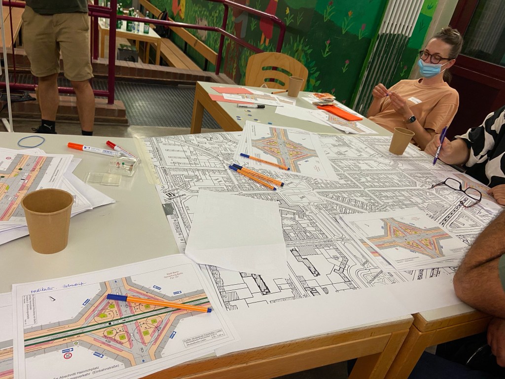 Am Ende treffe ich eine Nachbarin meiner Straße, die übrigens Physikprofessorin ist. Es sei ihre zweite Planungswerkstatt gewesen, erzählt sie, und die erste, die habe sie eigentlich völlig entmutigt: Damals ging es um den Alfred-Döblin-Platz, und das einzige Anliegen der Anwohner:innen war, dass die Radfahrenden am Durchrasen gehindert werden. Mit dem Ergebnis, dass die Radfahrenden weiterhin ungehindert durchrasen.