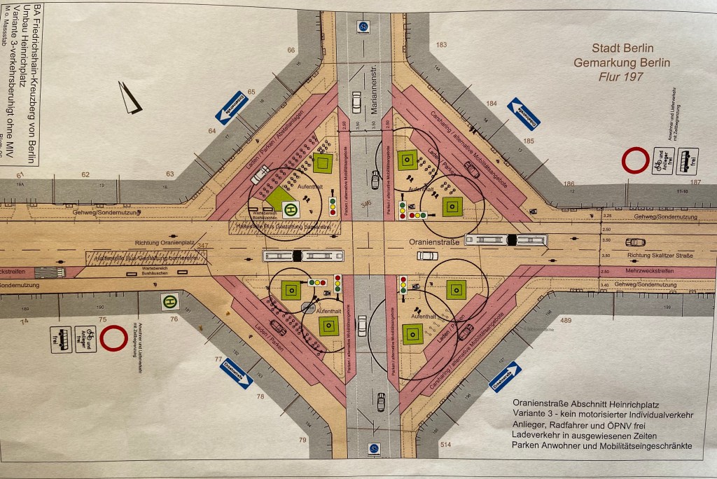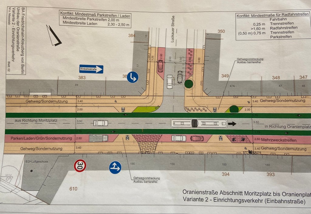 Uns werden 3 Planungsvarianten für die Umgestaltung der Oranienstraße vorgestellt: Variante 1 mit „Mischverkehr“ sieht kaum Veränderungen vor; die zweite Variante sieht die Einrichtung einer Einbahnstraße vor, die dritte sogar „keinen motorisierten Individualverkehr“, sondern eine Anliegerstraße. (Mehr zum Bauvorhaben des Bezirks ab 2023 hier)