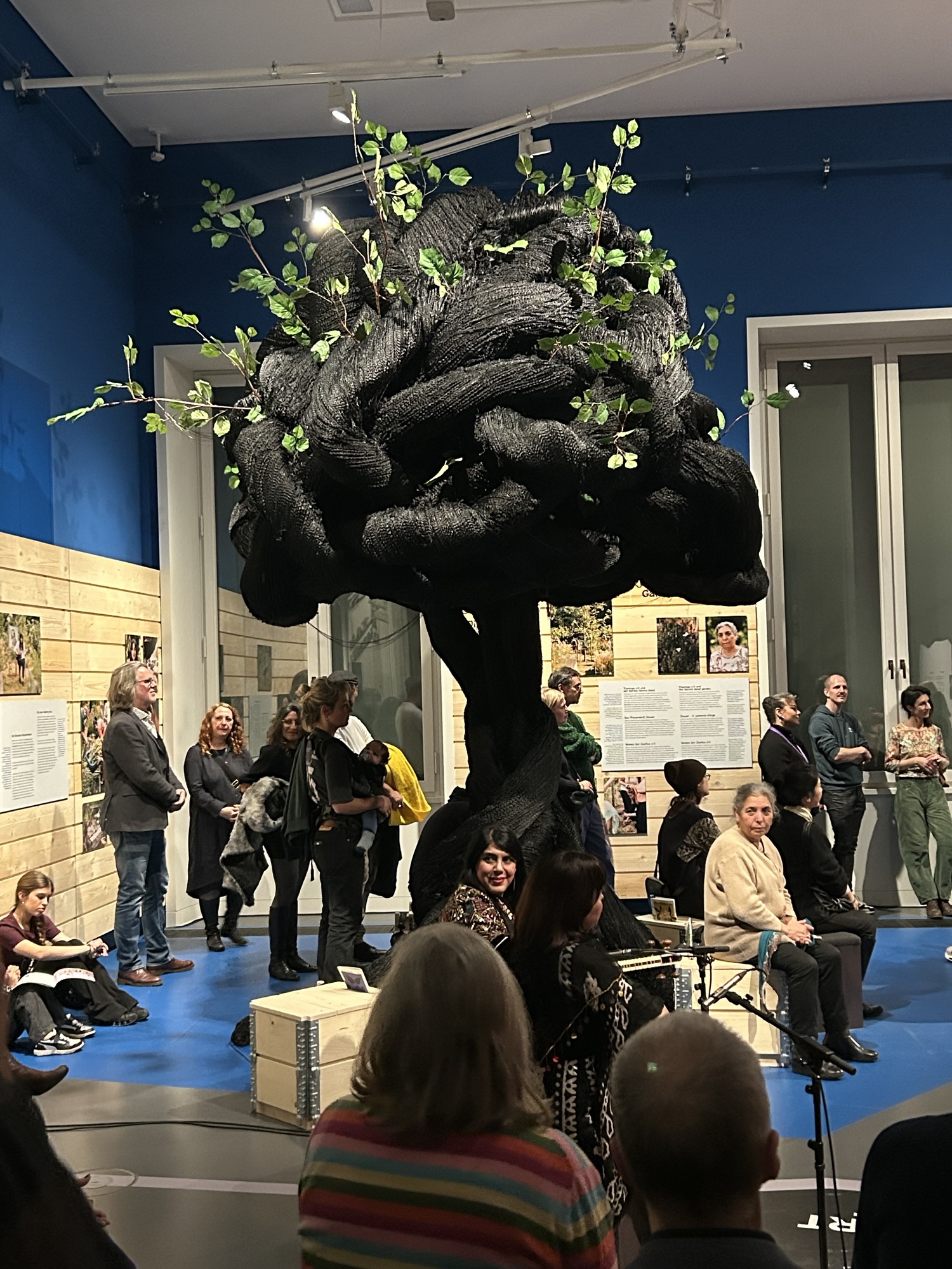 Während sie spricht steht Anuscheh Amir-Khalili unter der gewaltigen Skulptur des schwarzen Maulbeerbaums von Ela Pour, dessen Textur aus schwarzem und verschlungenem Kunsthaar Trauer, aber auch Erdverbundenheit und Kraft symbolisieren. So wie die ganze vom Verein flamingo e.V. gestaltete Freifläche von BERLIN GLOBAL im Humboldt Forum über seinen Garten Hevrîn Xelef ein Ort des gemeinsamen Trauerns und Gedenkens ist, besonders an diesem Abend der Ausstellungseröffnung.